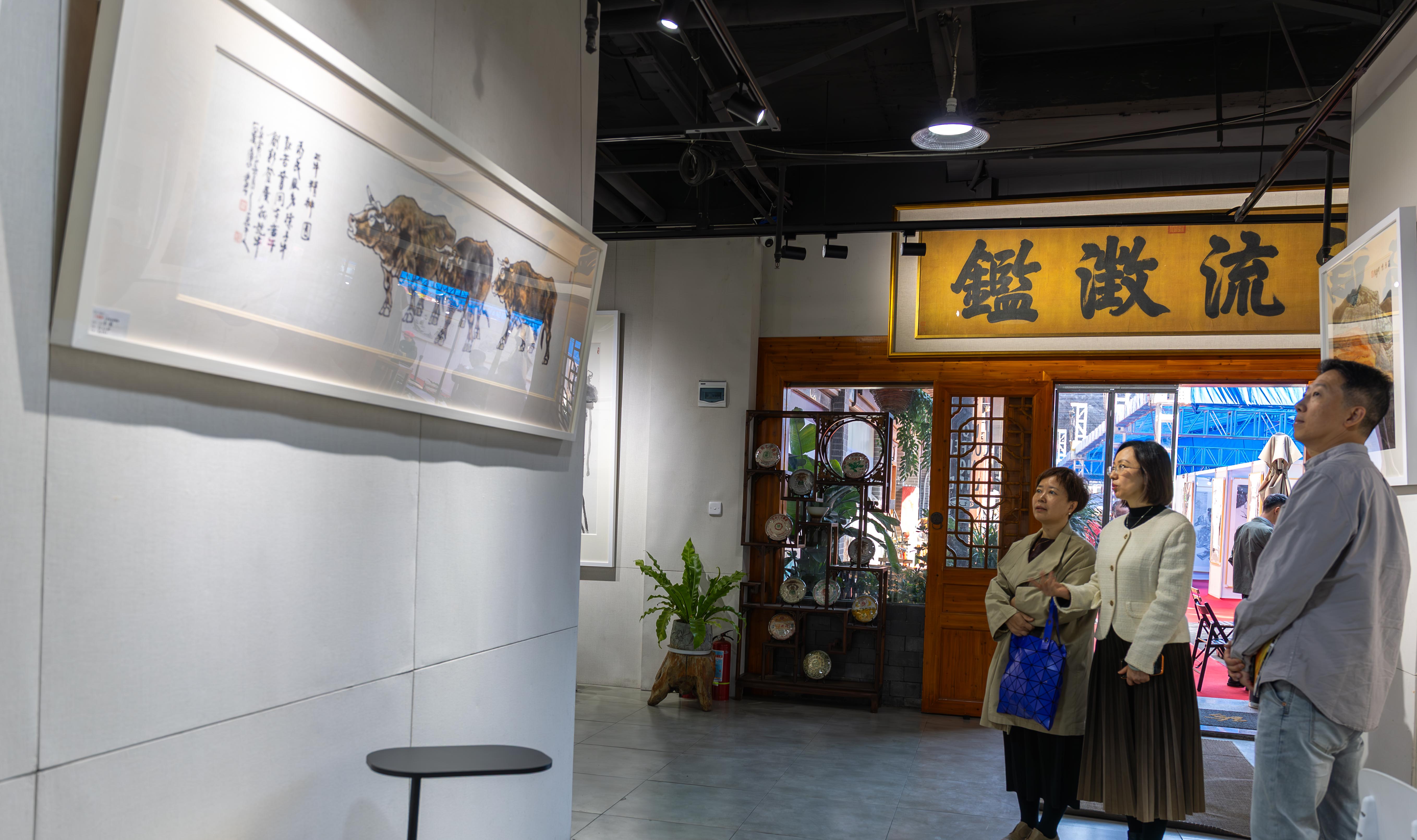 作为本次活动最大的亮点,三大重磅特展各具特色又相得益彰。《写意乾坤·方国兴书画瓷三绝艺术展》涵盖书画及青花瓷、釉里红作品,重点呈现瓷板画系列,跨界艺术大师方国兴将篆书、隶书笔法融入绘画,并把书画融于瓷艺,独创出“方隶”“方竹”“国兴兰”等艺术符号。《“三牛”精神石金库中国画展》以笔墨为刃,借鉴中西艺术之长,生动刻画了“孺子牛”“拓荒牛”“老黄牛”的鲜活形象,深刻诠释新时代“三牛”精神的内涵,传递出蓬勃向上的力量。《邵梦龙国画人物精品展》塑造出一个个栩栩如生的历史和当代人物形象,画风凝重雄厚却不失纤巧细腻,让观众在笔墨流转间感受人文精神的传承。