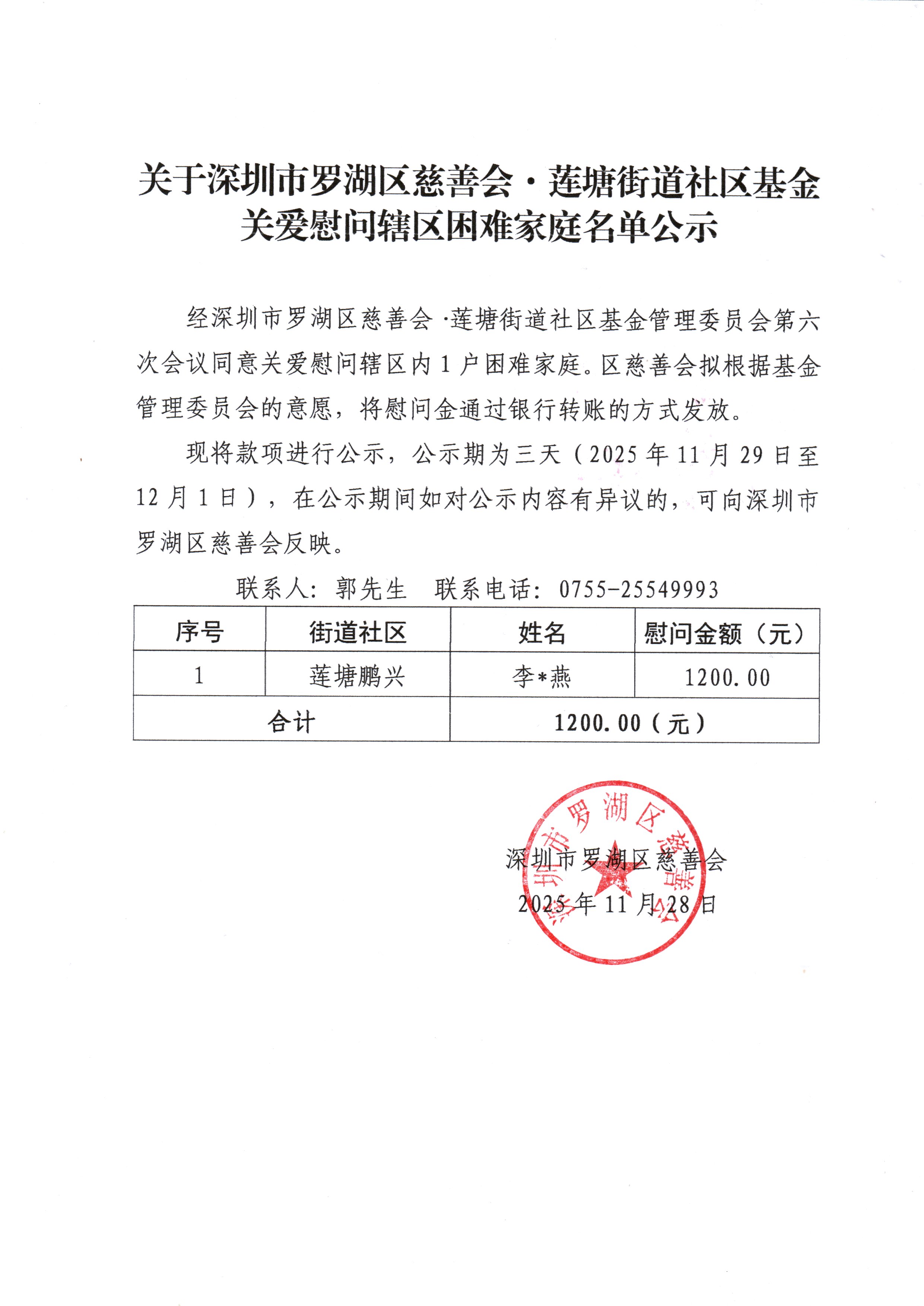 经深圳市罗湖区慈善会·莲塘街道社区基金管理委员会第六次会议同意关爱慰问辖区内1户困难家庭。区慈善会拟根据基金管理委员会的意愿,将慰问金通过银行转账的方式发放。