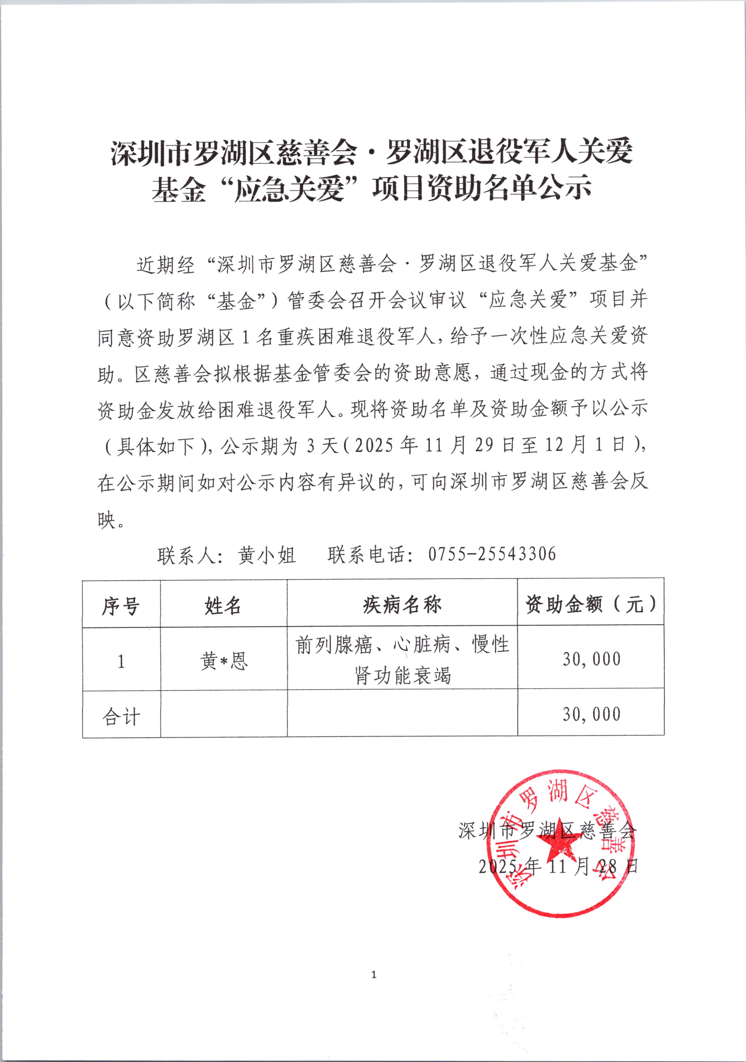 近期经“深圳市罗湖区慈善会·罗湖区退役军人关爱基金”(以下简称“基金”)管委会召开会议审议“应急关爱”项目并同意资助罗湖区1名重疾困难退役军人,给予一次性应急关爱资助。区慈善会拟根据基金管委会的资助意愿,通过现金的方式将资助金发放给困难退役军人。现将资助名单及资助金额予以公示,具体如下: