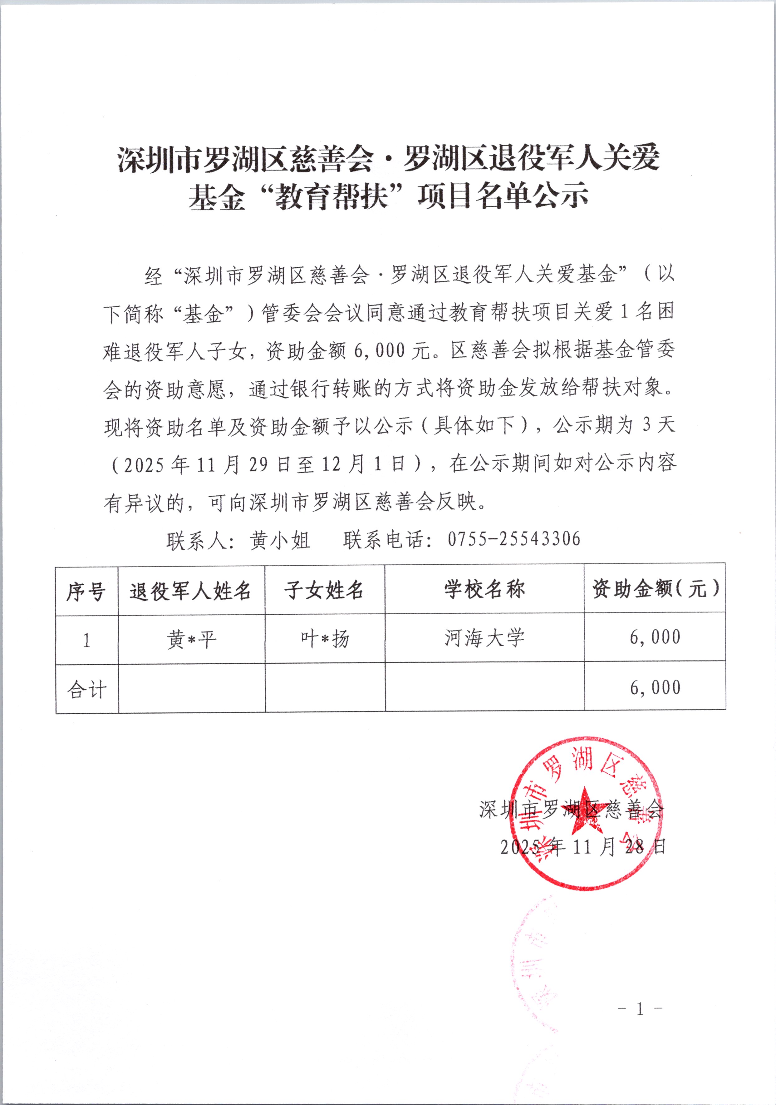 经“深圳市罗湖区慈善会·罗湖区退役军人关爱基金”(以下简称“基金”)管委会会议同意通过教育帮扶项目关爱1名困难退役军人子女,资助金额6,000元。区慈善会拟根据基金管委会的资助意愿,通过银行转账的方式将资助金发放给帮扶对象。现将资助名单及资助金额予以公示,具体如下: