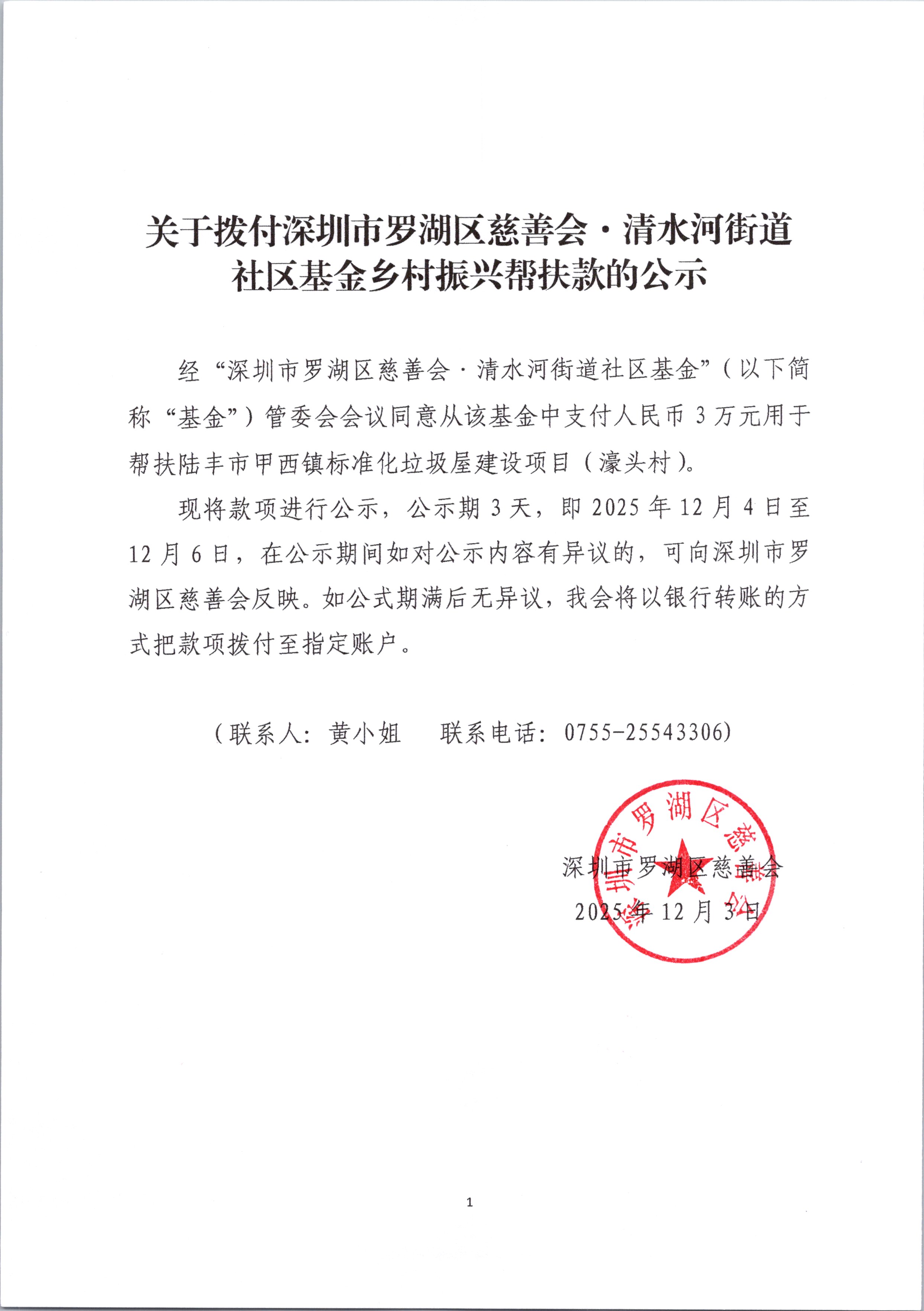 经“深圳市罗湖区慈善会·清水河街道社区基金”(以下简称“基金”)管委会会议同意从该基金中支付人民币3万元用于帮扶陆丰市甲西镇标准化垃圾屋建设项目(濠头村)。