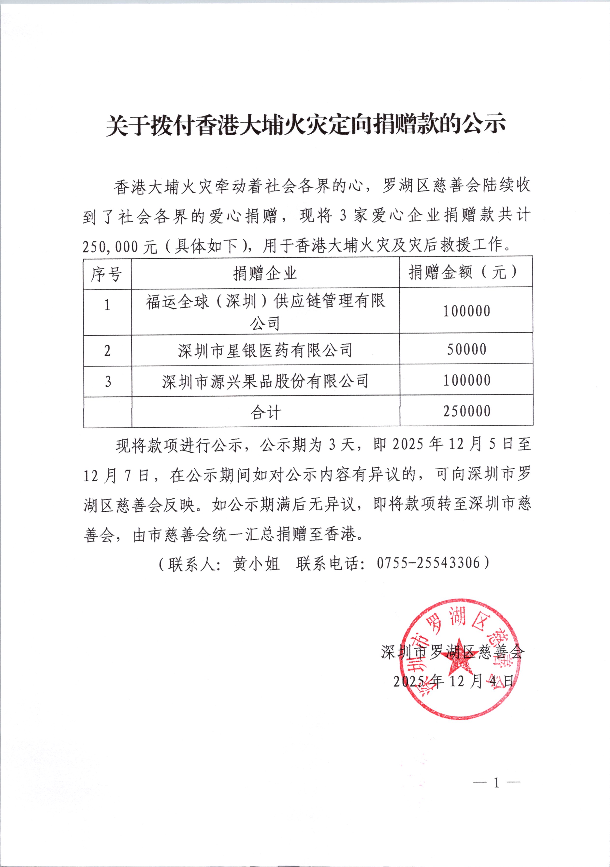香港大埔火灾牵动着社会各界的心,罗湖区慈善会陆续收到了社会各界的爱心捐赠,现将3家爱心企业捐赠款共计250,000元,具体如下:
