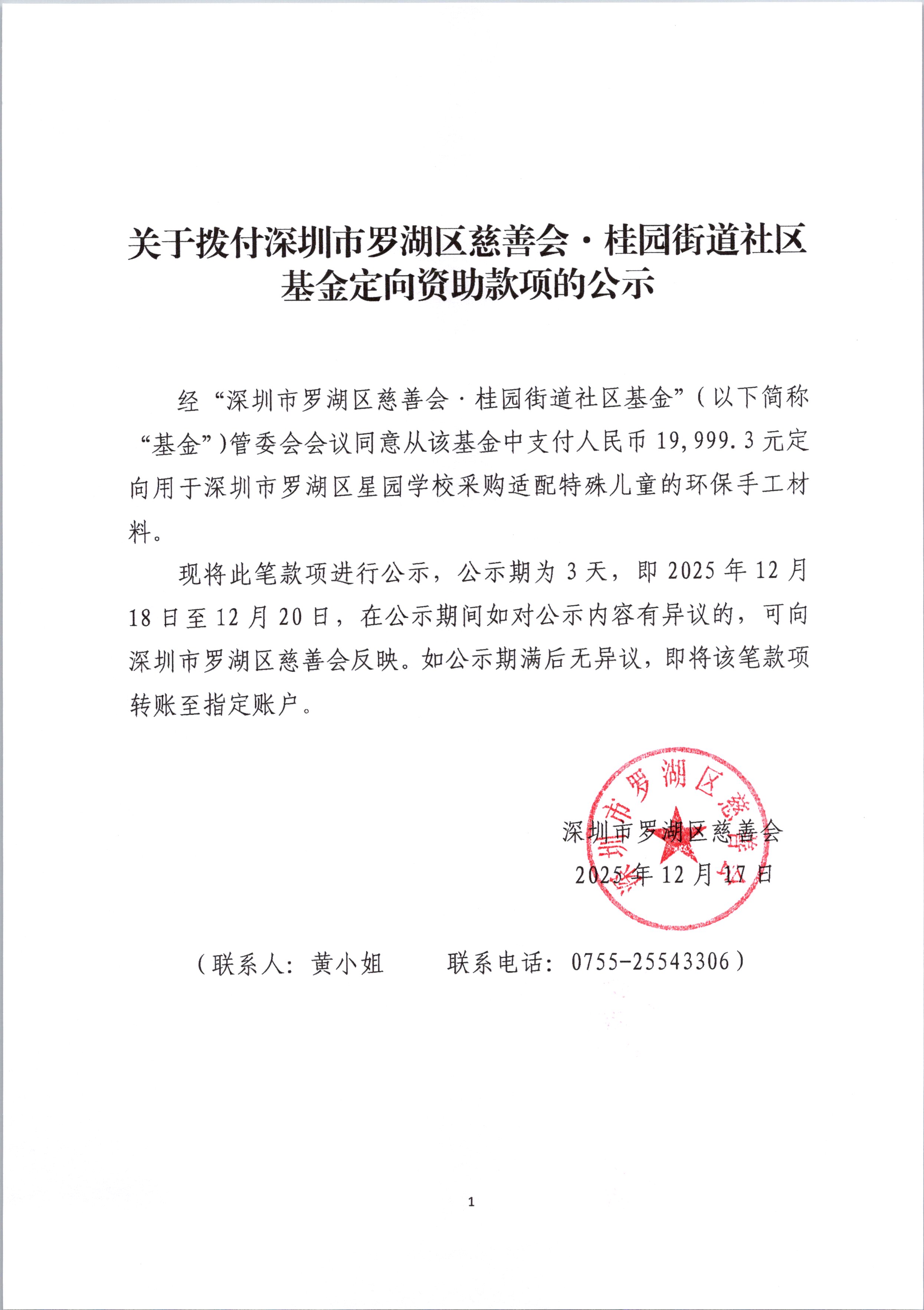 经“深圳市罗湖区慈善会·桂园街道社区基金”(以下简称“基金”)管委会会议同意从该基金中支付人民币19,999.3元定向用于深圳市罗湖区星园学校采购适配特殊儿童的环保手工材料。