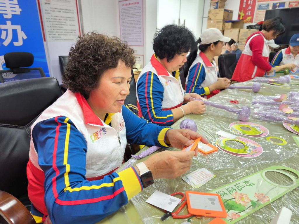 随后,活动进入温情满满的手工制作环节。志愿者们围坐在一起亲手制作艾草养生锤。从仔细填充艾草药包,到用心整理棉布、细致捆扎,每一个步骤都凝聚着他们的耐心与爱心。这些充满手作温度的艾草养生锤,与之前备好的“长者平安守护卡”相结合,共同组成了一份份独具匠心的“暖心礼包”。礼包中既承载了手工的温暖与健康的祝愿,也寄托着一份对高龄长者平安日常的贴心守护。