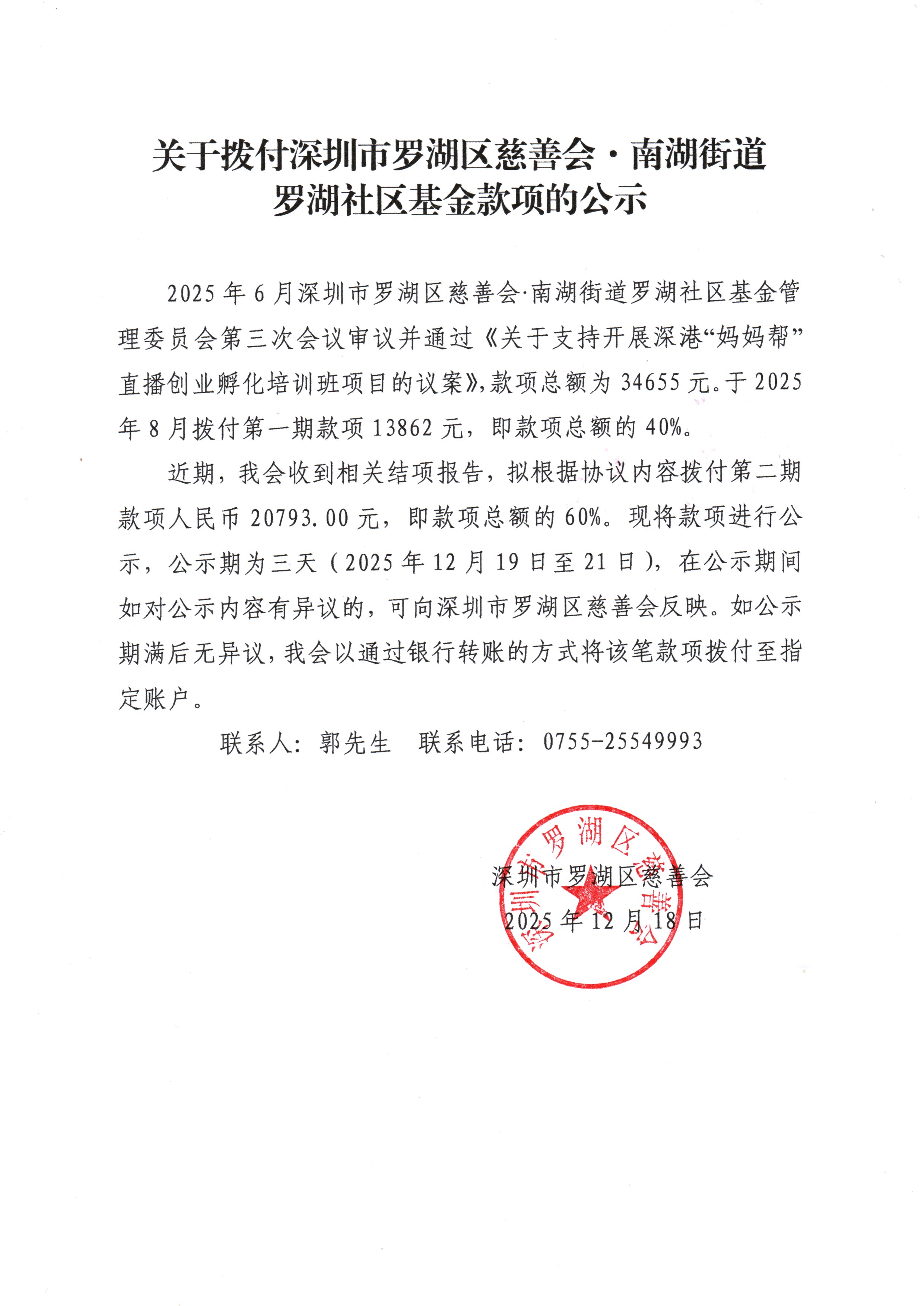 关于拨付深圳市罗湖区慈善会·南湖街道罗湖社区基金款项的公示