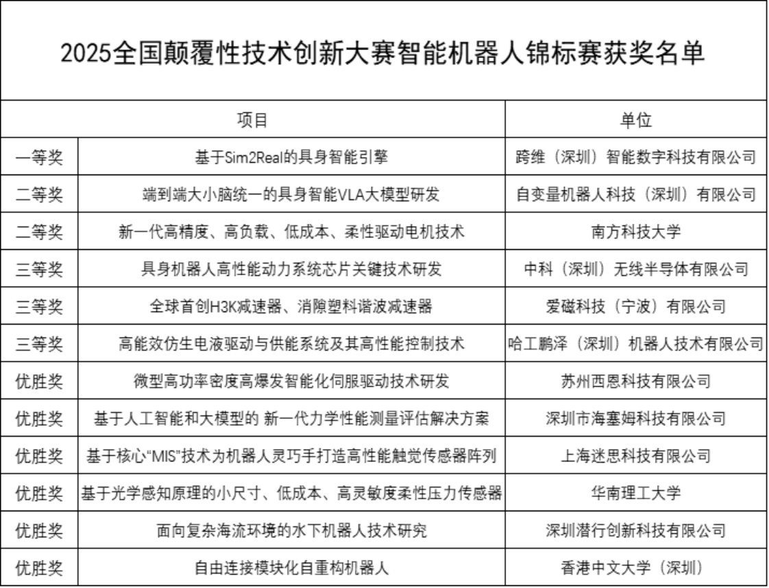 颠覆性技术创新,是重大前沿技术在重大战略领域的开创性转化应用,是发展新质生产力的重要新动能。作为颠覆性技术创新生态体系的核心平台,全国颠覆性技术创新大赛始终坚持“创新不问出身、英雄不论出处”。在深圳举办的首届智能机器人锦标赛,是全国颠覆性技术创新大赛首个落地的锦标赛。经过预赛、决赛两轮“项目路演+专家评议”的比拼,最终,12个优质项目脱颖而出。