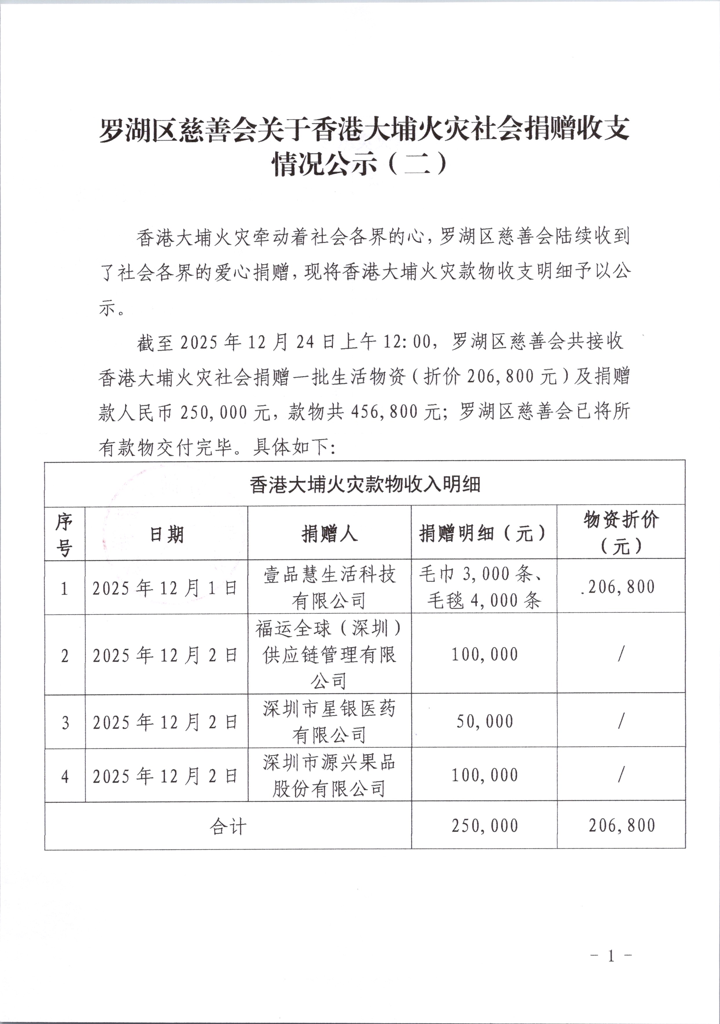 截至2025年12月24日上午12:00,罗湖区慈善会共接收香港大埔火灾社会捐赠一批生活物资(折价206,800元)及捐赠款人民币250,000元,款物共456,800元;罗湖区慈善会已将所有款物交付完毕。具体如下: