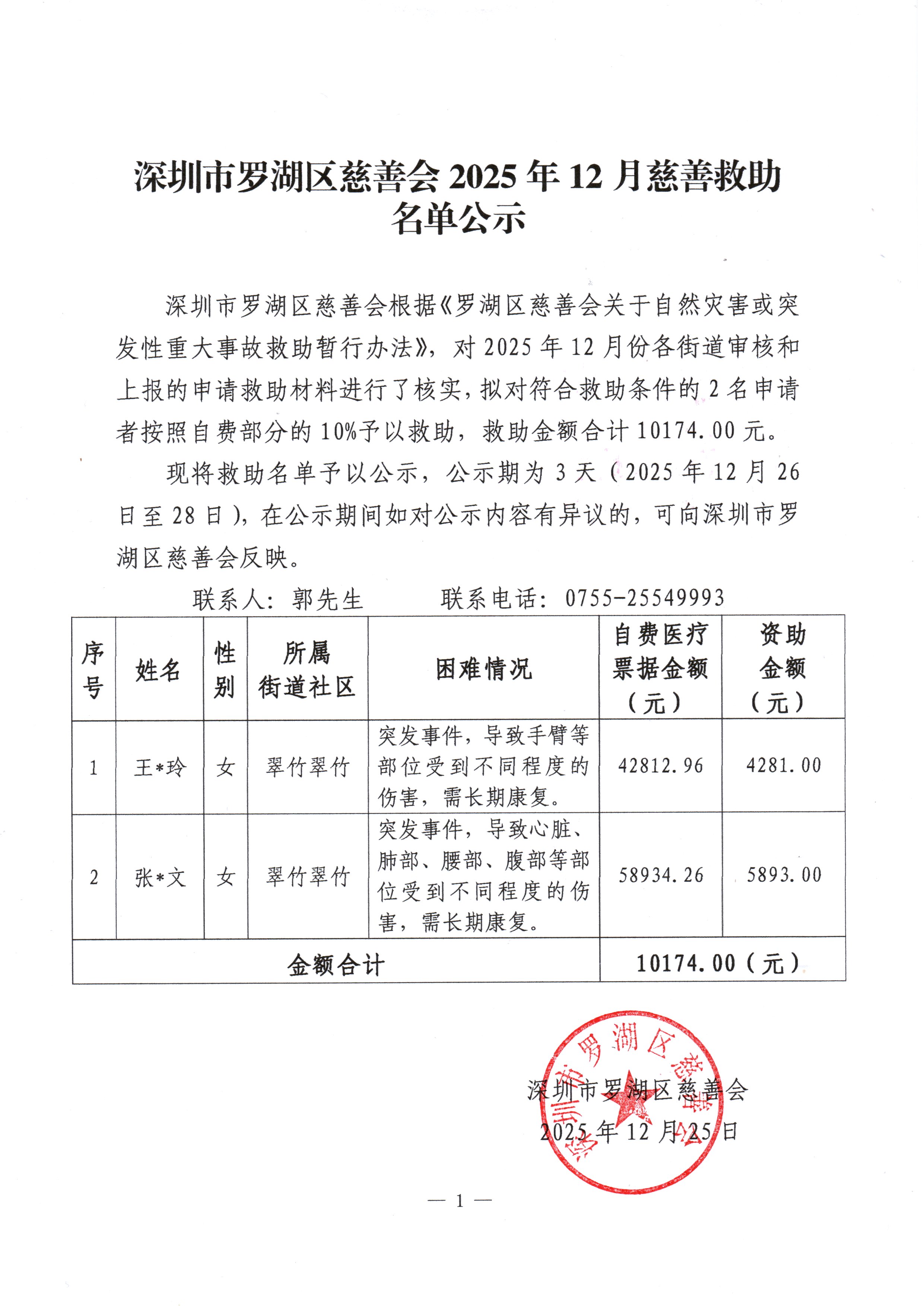 深圳市罗湖区慈善会根据《罗湖区慈善会关于自然灾害或突发性重大事故救助暂行办法》,对2025 年12月份各街道审核和上报的申请救助材料进行了核实,拟对符合救助条件的2名申请者按照自费部分的10%予以救助,救助金额合计10,174.00元。现将救助名单予以公示,