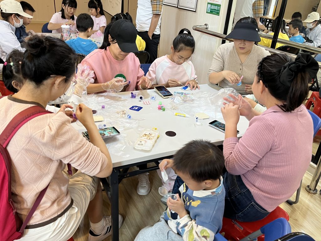 活动伊始,社工向大家介绍了肌理冰箱贴的创作原理、材料特性及制作技巧,细致讲解每一个步骤,并现场演示了工具的安全使用方法。创作环节,亲子家庭分工协作:有的孩子主导勾勒图案轮廓,家长协助调颜料;有的携手用画笔、海绵打造独特肌理;还有的巧用亮片装饰作品,现场专注又温馨,欢声笑语不断。经过近一小时精心打磨,朴素的石膏基底蜕变为兼具艺术质感与创意温度的专属冰箱贴,每件作品都承载着童真与爱意。