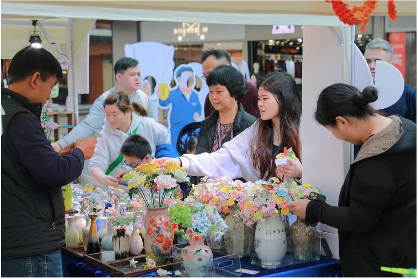 18个非遗与文创集市摊位人气爆棚,成为本次活动的“烟火气担当”。彩绘扇、手工中国结、苗银、苗族扎染、面塑等非遗手工艺品整齐陈列,琳琅满目。非遗传承人端坐摊位前,指尖翻飞间便将寻常材料打造成精美的艺术品,市民围在摊位前近距离观赏,主动与传承人交流技艺细节。