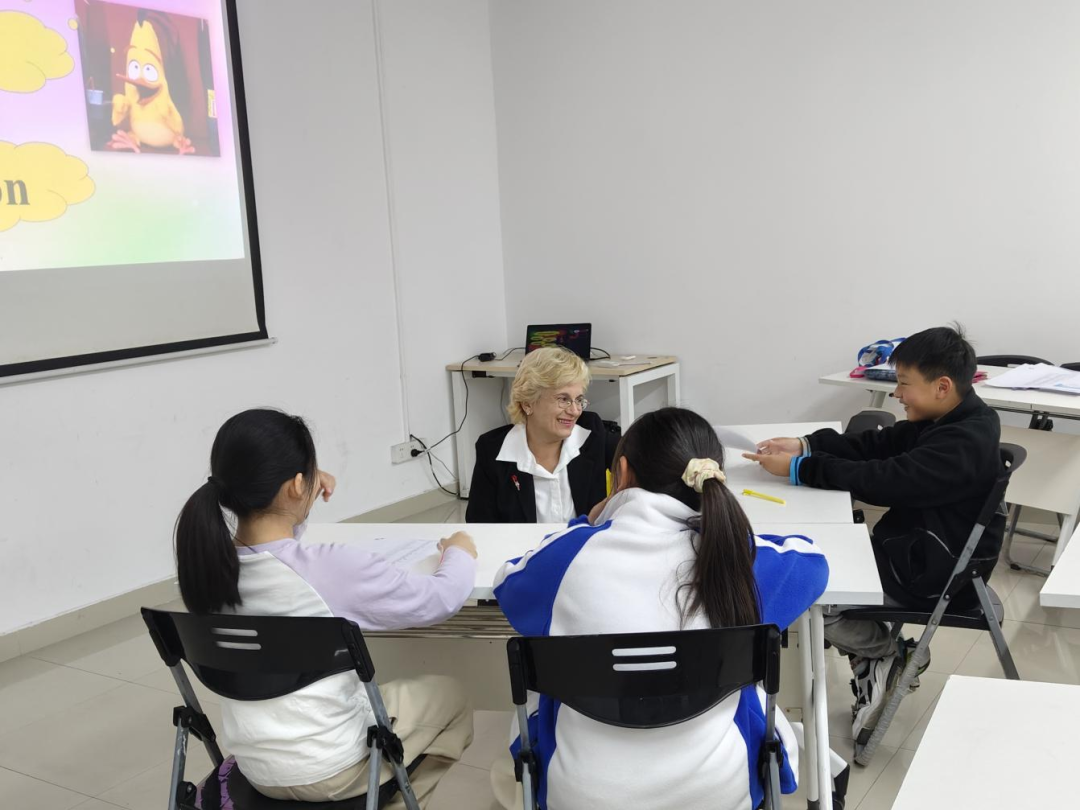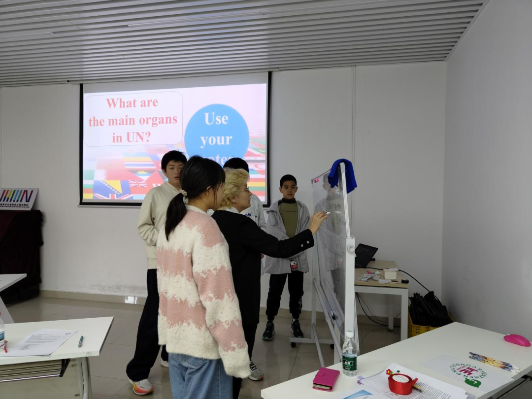 本次系列活动将分五期持续开展,聚焦跨文化沟通能力培育,以生动活泼的叙事方式助力沙河文化走向国际舞台,充分展现本土社区的独特魅力。活动采取“筑基”与“进阶”双轨并行模式:筑基组的学员们在外籍导师Tatiana的引导下,借助趣味任务用英语描述深圳的城市风貌与创新氛围;进阶组则围绕模拟联合国(MUN)展开,学员们通过学习联合国历史背景、参与英文实战演讲,全面提升公共表达与逻辑思辨能力。现场气氛热烈,少年们围绕联合国机制展开深入讨论,自信表达观点,展现出优秀的跨文化沟通能力。