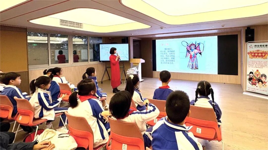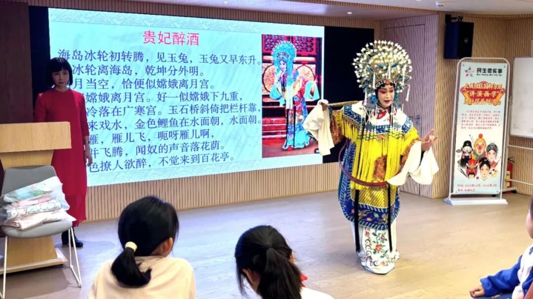 “海岛冰轮初转腾,见玉兔,玉兔又早东升。”当《贵妃醉酒》的旋律响起,专业京剧演员身着女蟒、头戴点翠凤冠登场时,课堂气氛达到高潮。华服随唱腔流转,千年故事在衣袖起落间复活,孩子们直观感受到“服化道”如何与表演融为一体,共同构筑戏剧的意境世界。