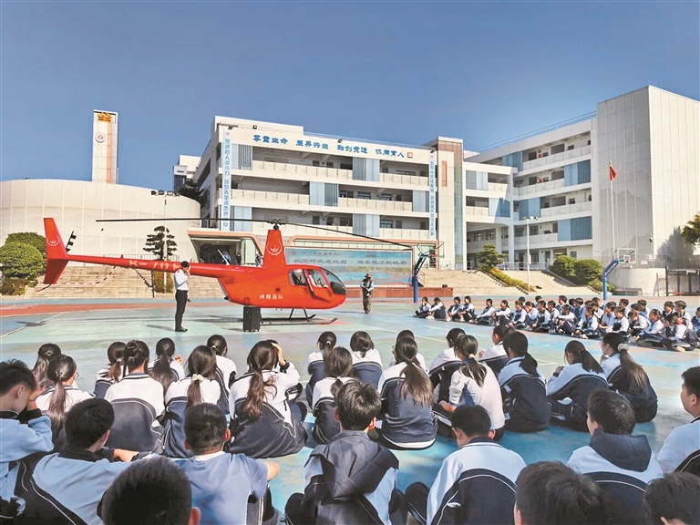 紧接着,课堂移至广阔操场。两批学生代表分组走近静卧的直升机,在直升机飞行员的引导下,他们仔细观察机身结构,聆听飞行原理,甚至探看驾驶舱内复杂的仪表。好奇的提问此起彼伏,科学的种子在指尖触碰机身的那一刻悄然生根。在飞行体验环节,学生们在严密的安全保障与老师陪同下依次登机体验,当直升机腾空而起,孩子们在操场爆发出一阵阵欢呼。