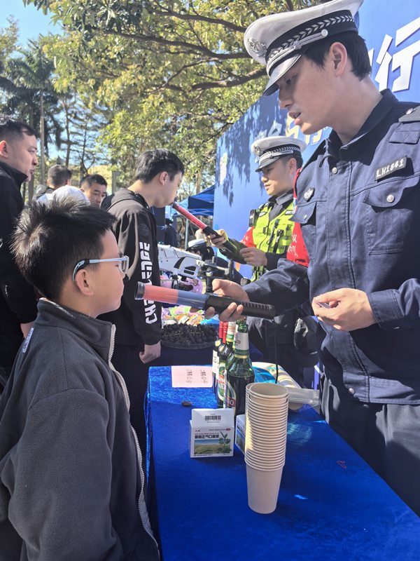 活动现场,罗湖交警设置了酒精测试与醉驾体验区,提供常见的酒类及非饮酒食品(如蛋黄派、酒心巧克力等)让市民朋友食用后进行酒精测试,以及佩戴特殊眼镜模拟醉酒状态的行走体验,直观感受“酒驾”危害,市民朋友直呼“头晕目眩,太危险了”,警示效果极强。