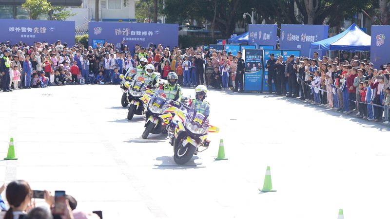 活动尾声伴随着引擎的轰鸣,罗湖交警铁骑展示驾驶技能及队列演练,铁骑摩托车在桩桶间灵活穿梭,急转、编队等一系列动作行云流水、精准默契,整齐划一。他们精湛的车技引来现场观众阵阵喝彩与掌声。