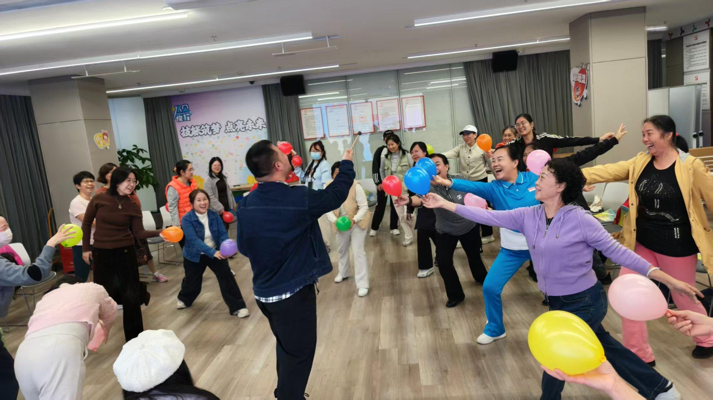 活动以“身体感知—关系建立—情绪表达”为主线,设计了层次丰富的体验环节。“10秒舞动接力”迅速活跃气氛,大家通过肢体语言展现个性、传递热情;正念练习中,导师借助气球引导呼吸调节,在触觉与听觉的融合中营造身心合一的感觉。
