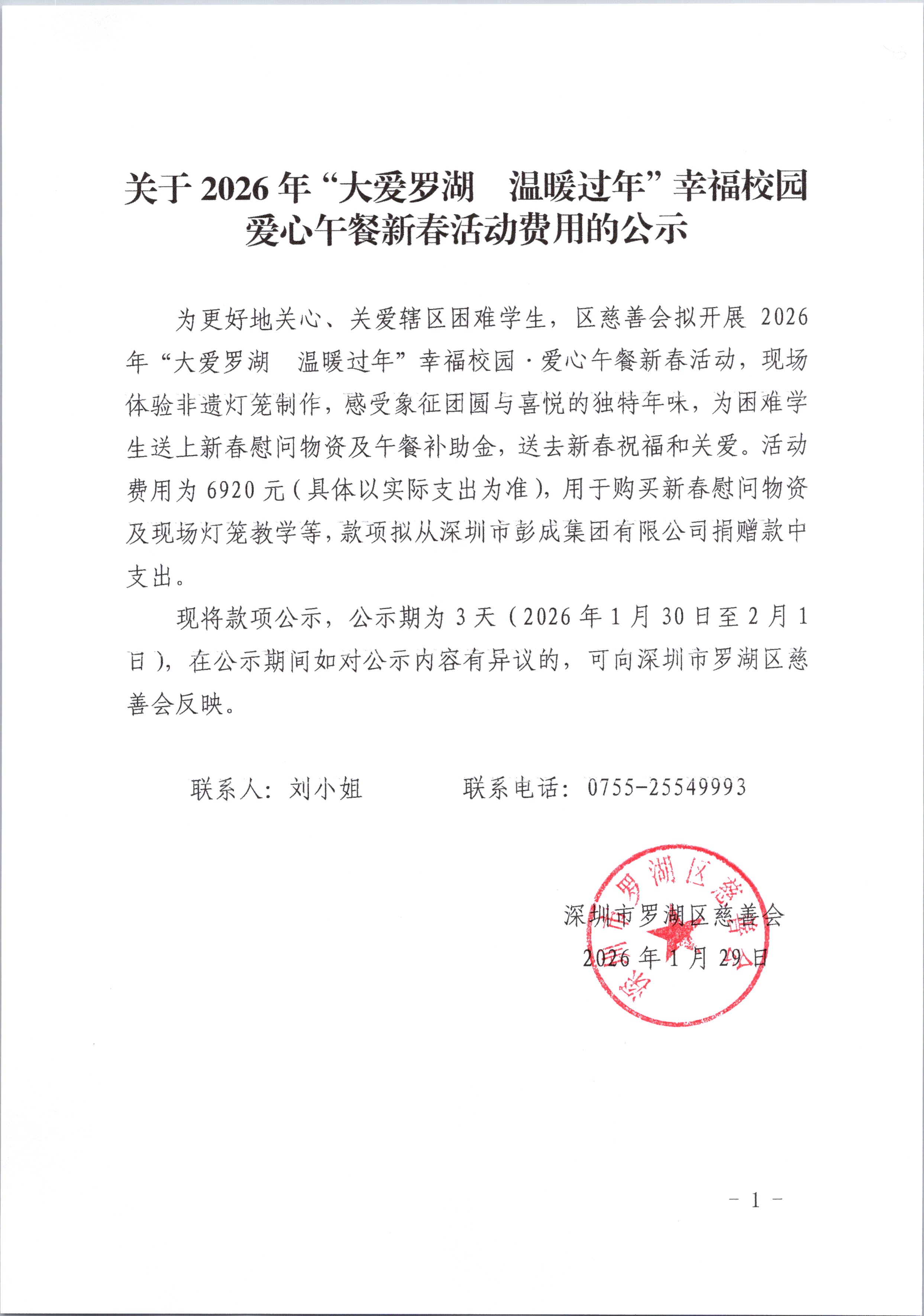 关于2026年“大爱罗湖 温暖过年”幸福校园爱心午餐新春活动费用的公示