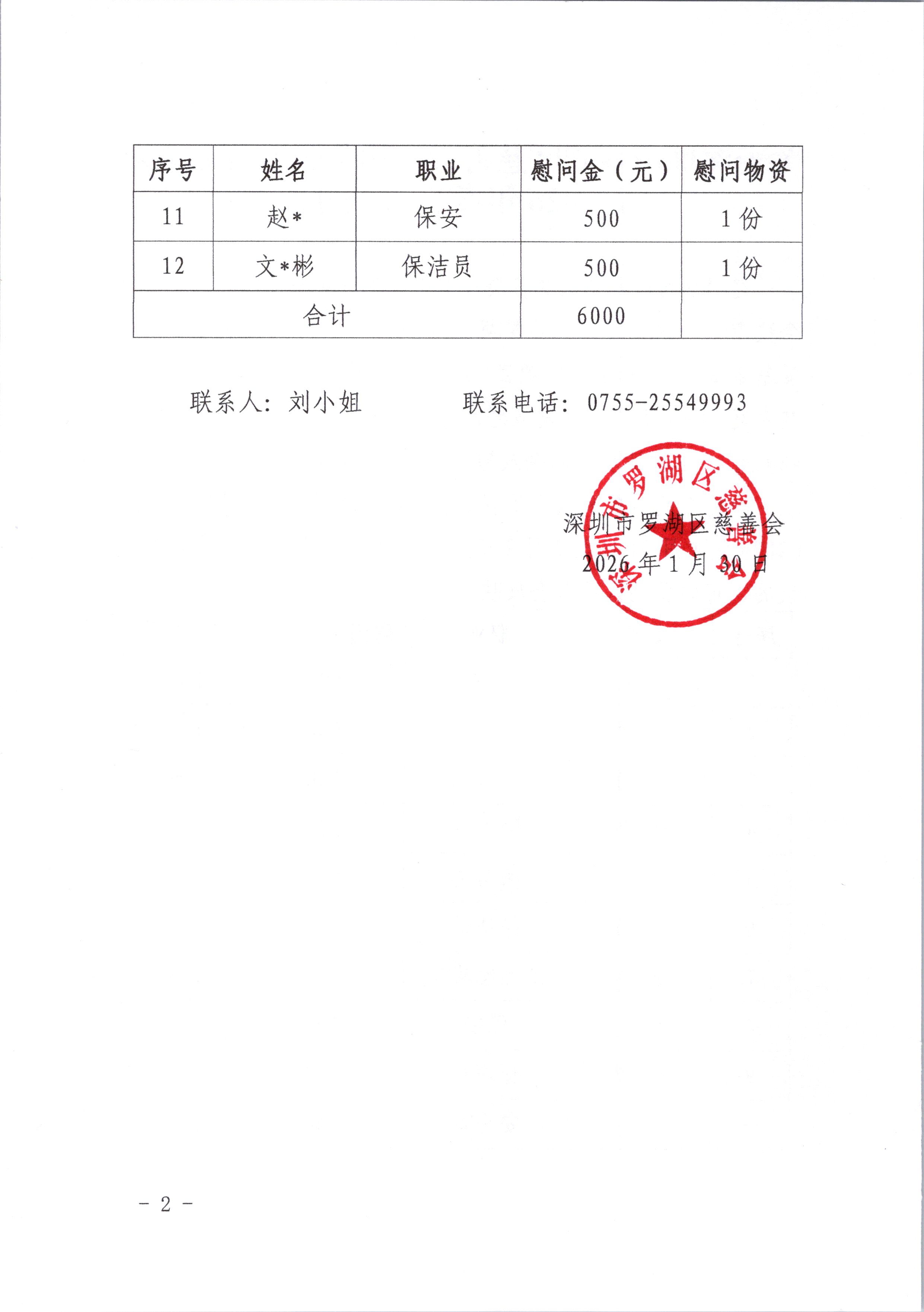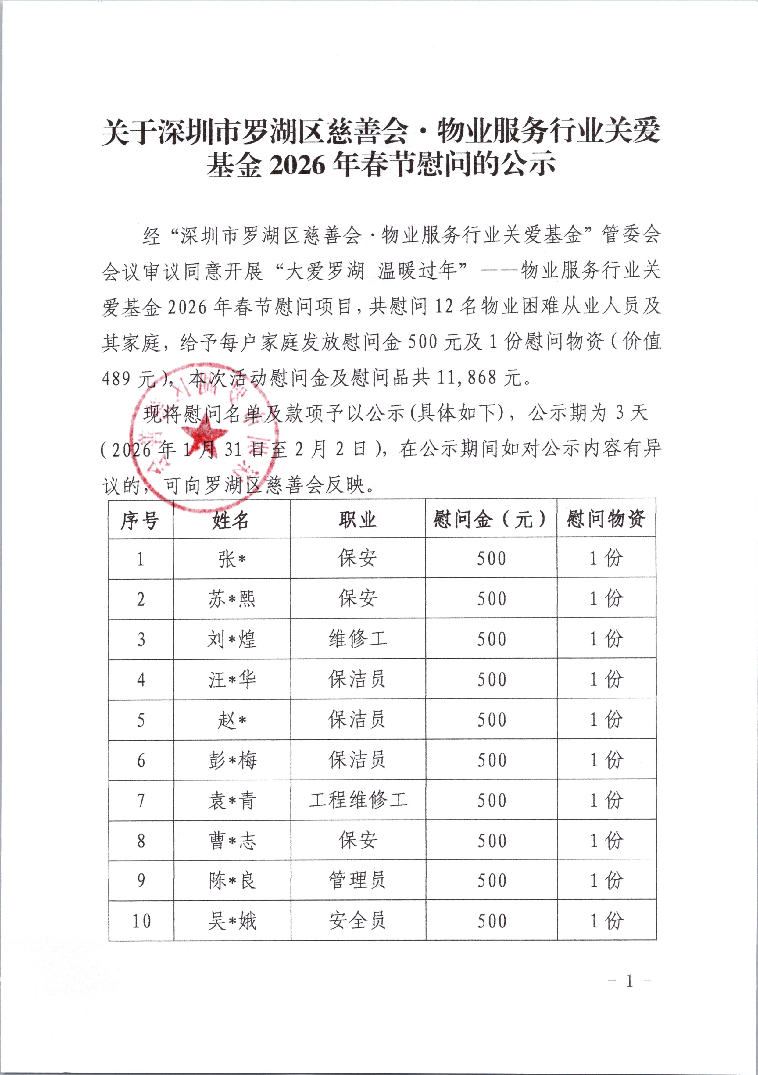 经“深圳市罗湖区慈善会·物业服务行业关爱基金”管委会会议审议同意开展“大爱罗湖 温暖过年”——物业服务行业关爱基金2026年春节慰问项目,共慰问12名物业困难从业人员及其家庭,给予每户家庭发放慰问金500元及1份慰问物资(价值489元),本次活动慰问金及慰问品共11,868元。