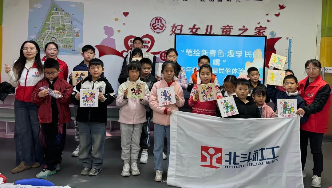 活动开始前,来自北斗社工机构的社工向孩子们讲解了春节的文化内涵与传承意义,鼓励大家在协作创作中交流互学,共同感受传统节日的底蕴。随后,社工以生动易懂的方式,介绍了春节的起源、2026马年的吉祥寓意,以及贴春联、“福”字倒贴等习俗。穿插其中的知识抢答环节气氛热烈,孩子们踊跃参与,在互动中加深了对民俗文化的理解。