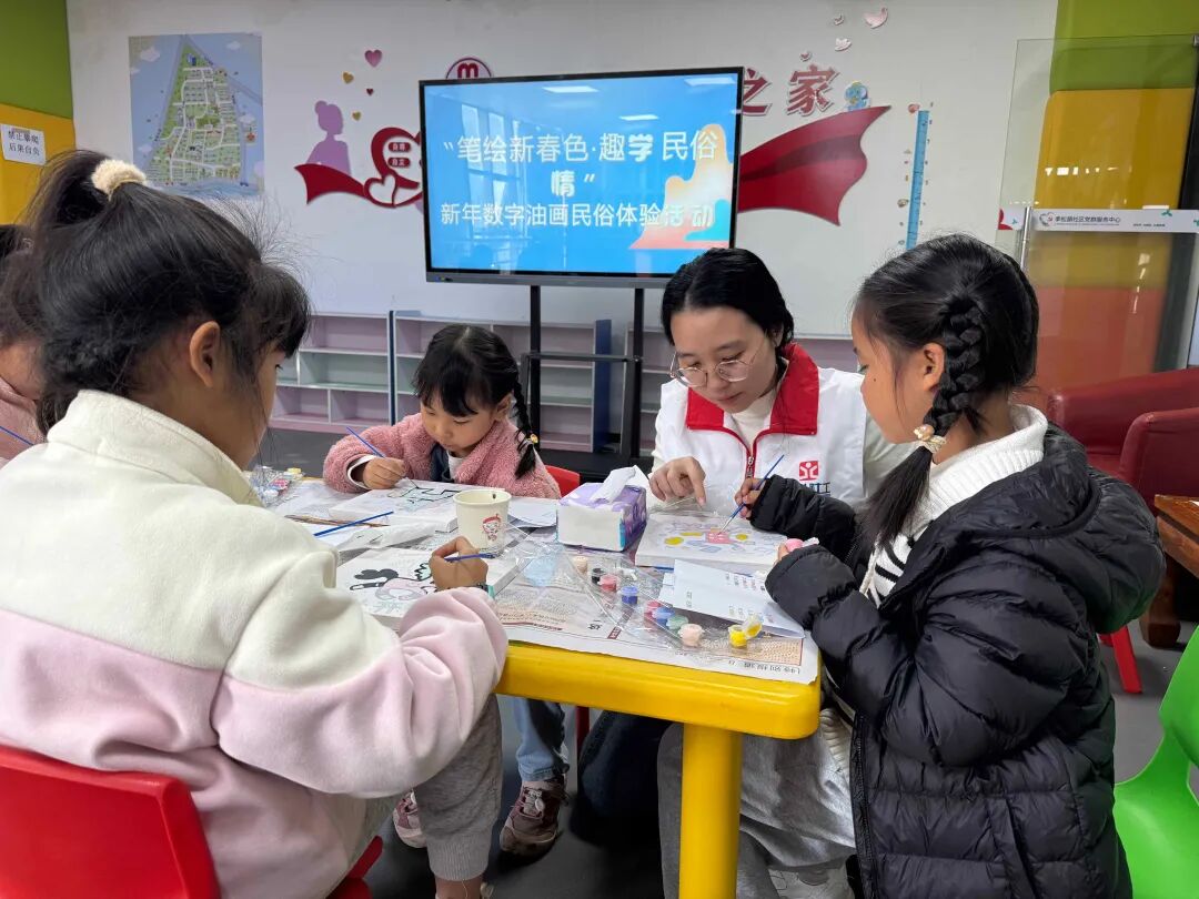进入绘画环节,孩子们分组合作,共同创作新春主题数字油画。现场分工有序,有的细心涂色,有的勾勒轮廓,不时交流着色技巧,过程融洽而有序。社工与志愿者全程陪伴,既耐心指导绘画步骤,也随时解答孩子们提出的民俗疑问,帮助他们在动手中进一步领悟传统文化内涵。经过细心描绘,一幅幅色彩明快、寓意吉祥的油画作品陆续完成,孩子们兴奋地举起作品合影,脸上洋溢着喜悦与自豪。