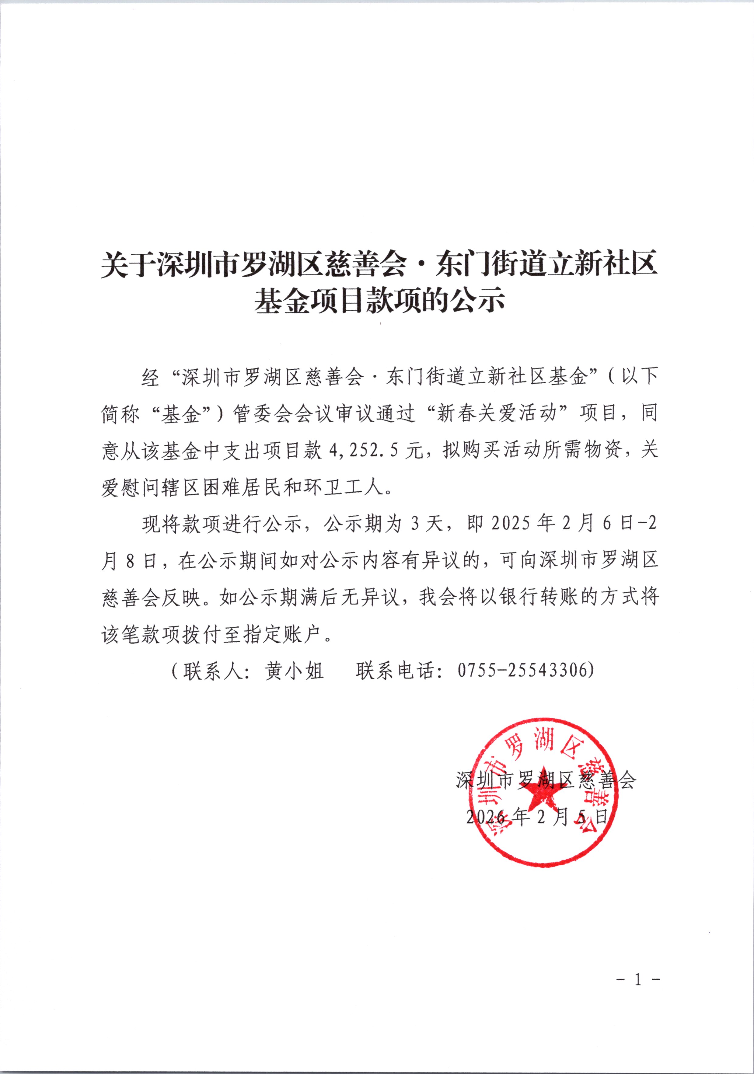 经“深圳市罗湖区慈善会·东门街道立新社区基金”(以下简称“基金”)管委会会议审议通过“新春关爱活动”项目,同意从该基金中支出项目款4,252.5元,拟购买活动所需物资,关爱慰问辖区困难居民和环卫工人。