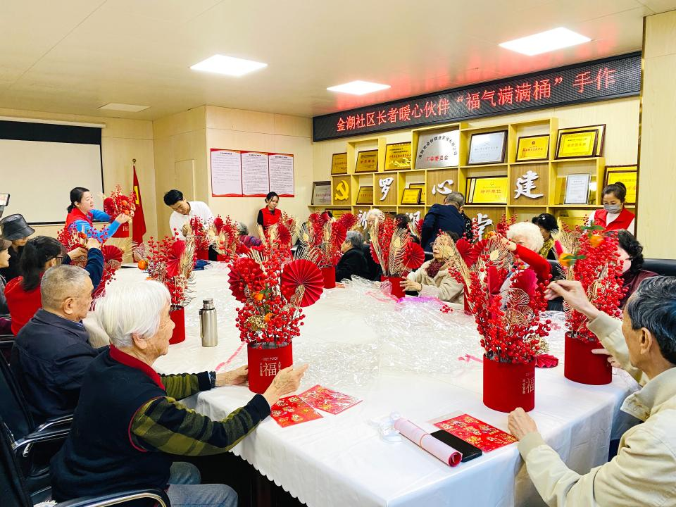 罗湖家园网讯:新春将至,岁寒情暖。为弘扬中华优秀传统文化,营造欢乐祥和的节日氛围,丰富社区长者的精神文化生活,2月5日下午,金湖社区党群服务中心组织开展了“巧手迎新春,福桶抱吉祥”长者暖心伙伴手作活动。社区20位独居、空巢及高龄长者欢聚一堂,亲手制作寓意吉祥的新春福桶,在温馨互动中感受浓浓年味与社区大家庭的温暖。