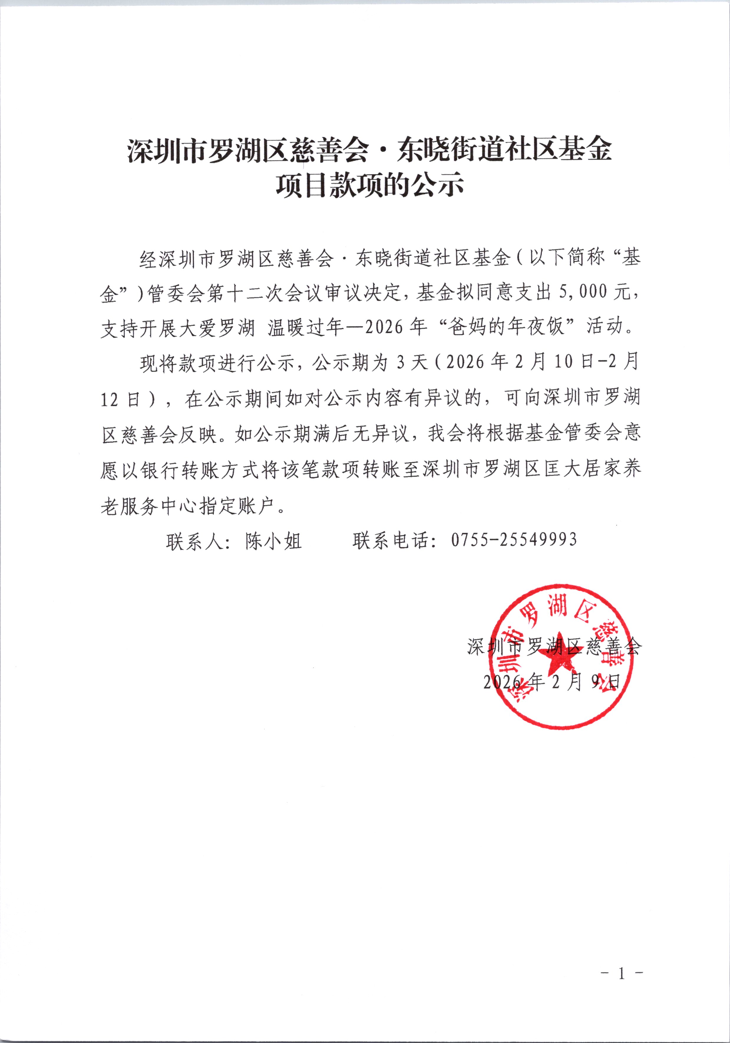 经深圳市罗湖区慈善会·东晓街道社区基金(以下简称“基金”)管委会第十二次会议审议决定,基金拟同意支出5,000元,支持开展大爱罗湖 温暖过年—2026年“爸妈的年夜饭”活动。