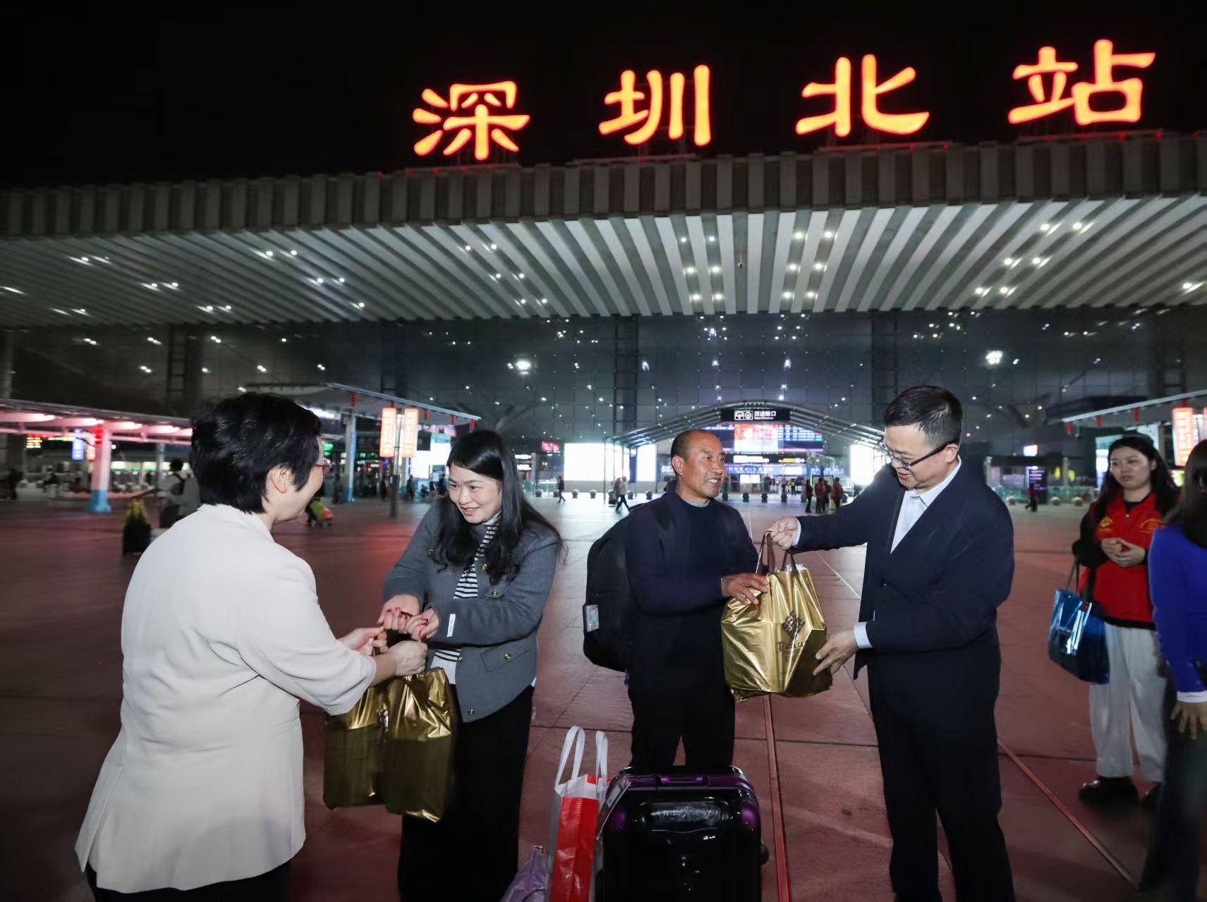 当晚,市人力资源保障局、市关爱办负责人早早等候在北站出站口,迎接返深务工人员,向大家致以新春问候,并发放“开工暖心礼包”。