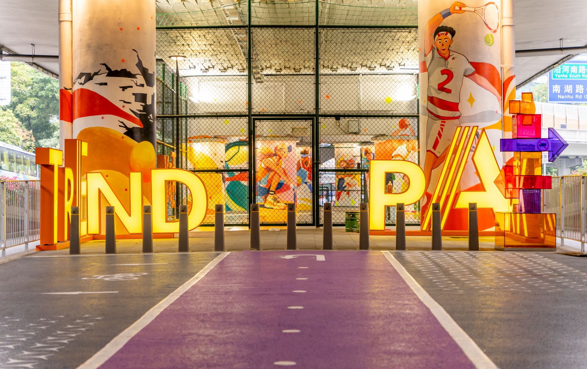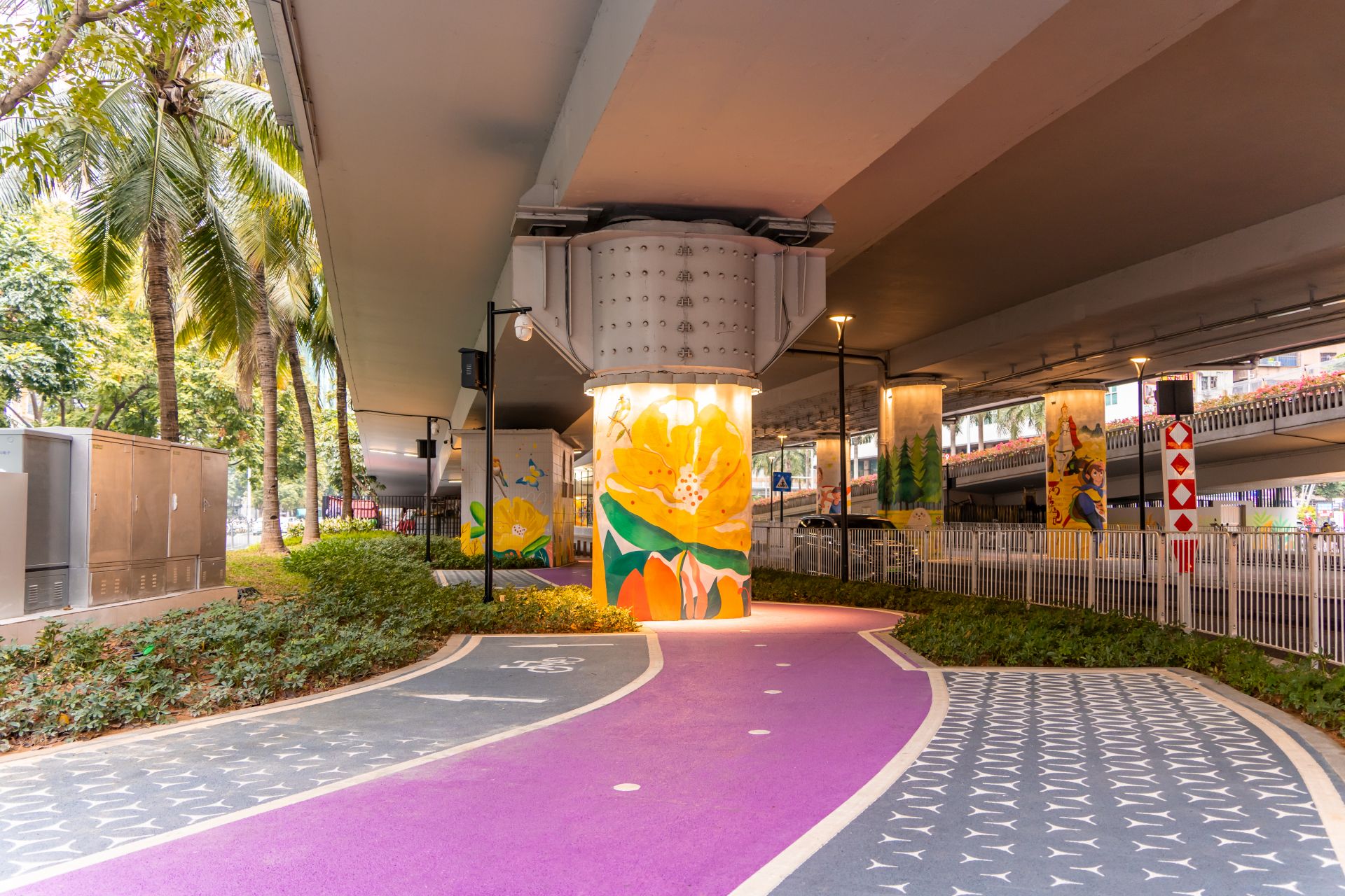下午的阳光斜斜穿过桥墩,落在春风乐园内的紫荆花之环,为这片公共空间镀上一层流动的金边。彩色步道上,孩子们的身影在玫粉与明黄间跳跃,更有亮橙、纯白、克莱因蓝,在混凝土的灰调、立柱上的国漫彩绘间穿梭。喧闹声对面,刚过境来深的香港市民陈小姐正与友人踮脚合影。“路过这里,忍不住进来看看。没想到从口岸出来,还有这么惬意的地方。”