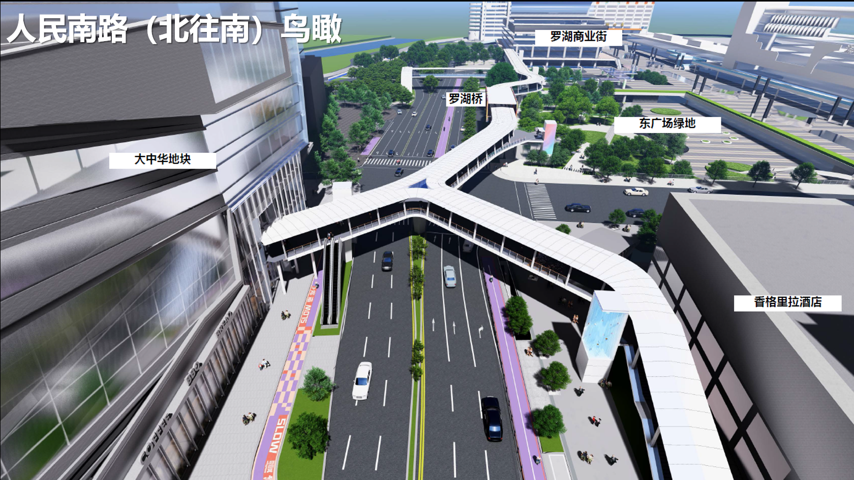 这条二层连廊全长约380米,呈南北走向,串联起罗湖商业城、公交场站、大榕树、火车站东广场以及人民南片区,沿途打造三大景观节点,预计2026年年中整体完工。届时,旅客从罗湖口岸出站,可以直通人民南商圈,实现“出关即入圈”,一站式满足文化休闲娱乐、品质酒店、特色餐饮、潮玩首店等不同消费需求,让“过境流量”真正转化为“消费留量”。