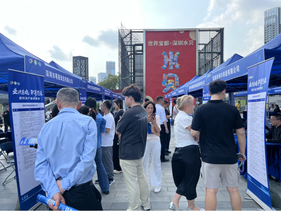 罗湖家园网讯:3月24日,由罗湖区东晓街道主办、深圳市人才产业园有限公司承办的“兴业东晓 职等您来”现代化产业专场招聘会在水贝珠宝总部大厦南广场举行。罗湖区委组织部(区人才工作局)、区总工会、独树社区党群服务中心、深圳市水贝珠宝物业服务有限公司、深圳市五环晨曦物业管理有限公司共同支持。